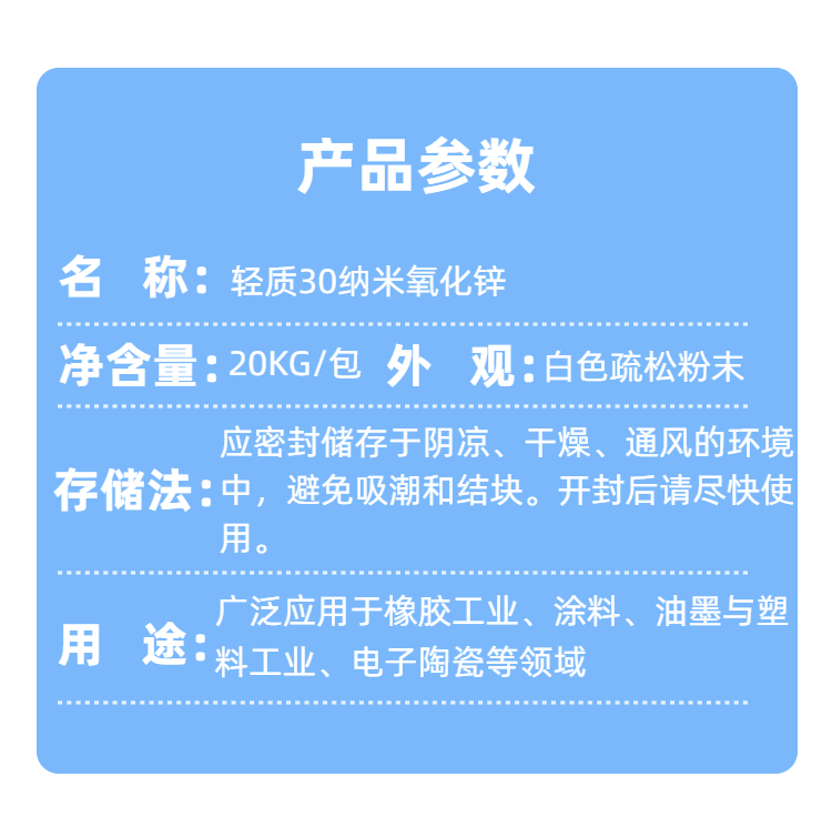 本产品是由肇庆市新润丰高新材料有限公司采用低温可控化学沉淀法制备的高纯度纳米氧化锌。其平均一次粒径严格控制在30纳米左右,具备典型的六方纤锌矿晶体结构、高比表面积及良好的分散性能。产品为白色疏松粉末,广泛应用于橡胶、涂料、塑料、陶瓷等领域,作为高性能功能性添加剂,可显著提升终端产品的力学性能、抗菌性、紫外屏蔽性和电学特性。相较于10纳米产品,本产品在保证优异性能的同时,具有更好的性价比。